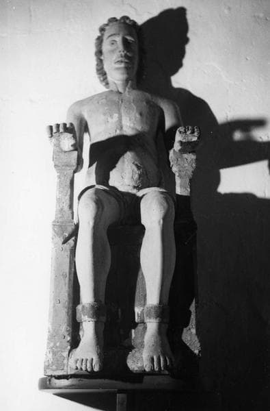 9 statues : Christ en croix, saint Pierre, saint Michel, saint Jean-Baptiste, saint Roch, saint Quentin, saint Hubert, saint Laurent, sainte Catherine