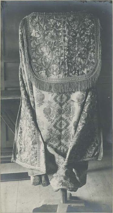 Soie blanche à décor broché vert et or et soie brodée de rinceaux et de fleurs polychromes sur fond or.