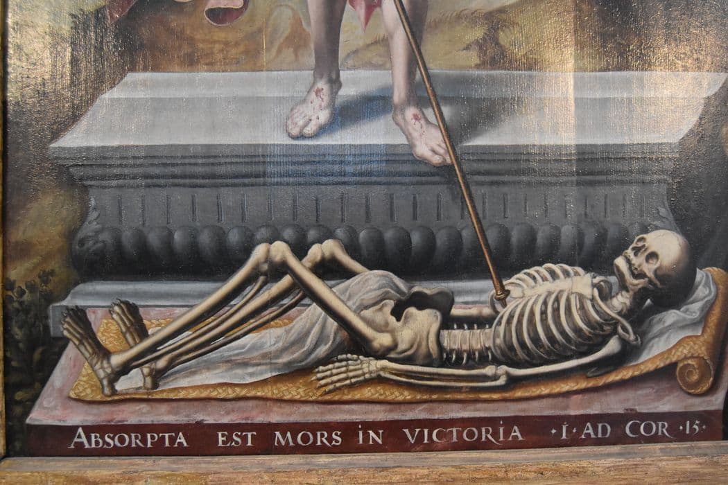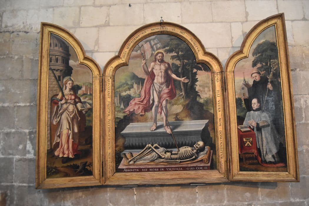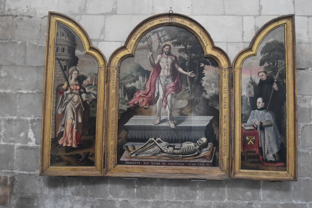 Tableau (triptyque) : Résurrection du Christ, sainte Barbe, saint Robert et le chanoine Robert de saint Martin, donateur
