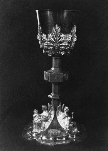 Sur le pied : 3 groupes : Foi, Espérance et Charité. Au noeud de la tige, trois médaillons : la Vierge, saint Jean et saint Pierre. La coupe est ornée d'épis de blés et de grappes de raisins.