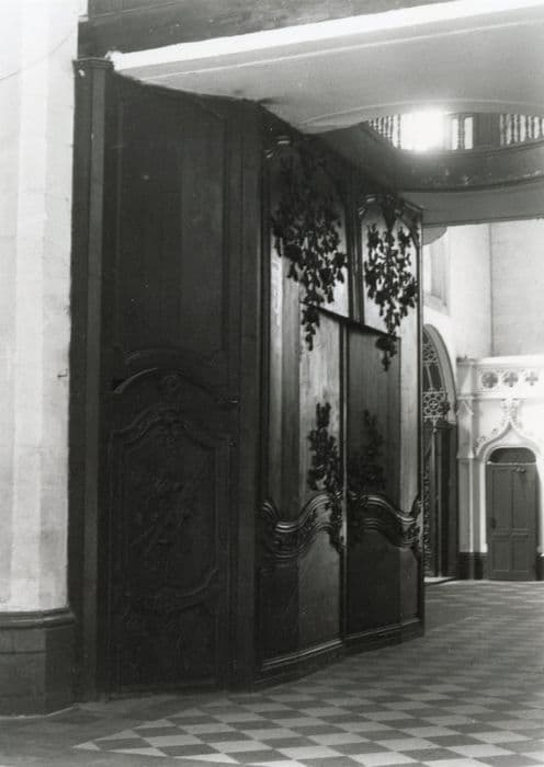 Tambour à deux vantaux principaux et deux vantaux latéraux.