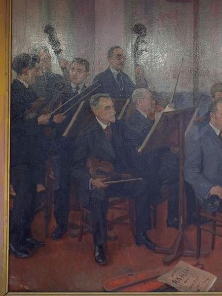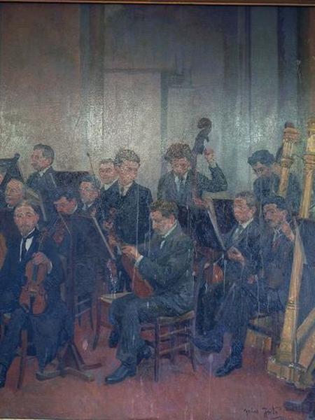 L'arrêté indique : 1. L'orchestre. Tableau. Huile sur toile. Signé et daté en bas à droite, Jules Joëts. Exposé en 1923 au Salon des Artistes Français. Hauteur : 2,70 m. Longueur : 7,00 m.