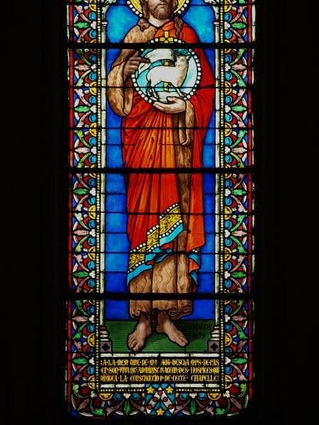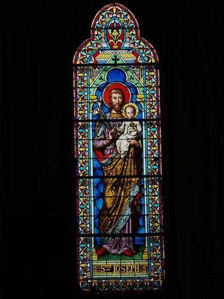 Ensemble de 5 verrières figurées : Saint Jean-Baptiste, saint François d'Assise, sainte Elisabeth, saint Joseph père nourricier du Christ, saint Michel terrassant le démon