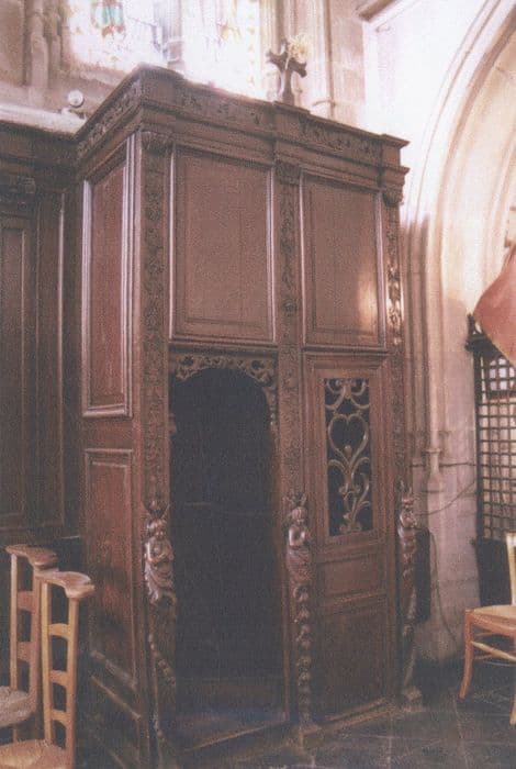 Confessionnal à panneaux de boiseries moulurés dont les montants sont ornés de chutes de feuillage et de fleurs ainsi que l'entablement. La partie supérieure de la porte est ajourée. Au milieu de trois des montants, des figures en haut-relief d'anges en prière.