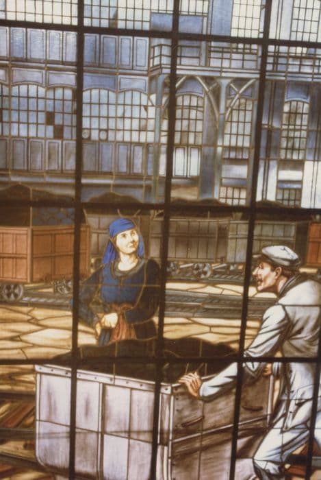 POP | Plateforme ouverte du patrimoinedeux verrières de l'escalier d'honneur : Mineurs travaillant au fond et Vue de la cour de la fosse n°5 de Bruay