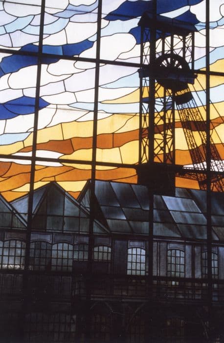 deux verrières de l'escalier d'honneur : Mineurs travaillant au fond et Vue de la cour de la fosse n°5 de Bruay