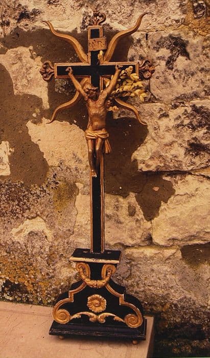Croix en bois peint en noir et doré, située sur l'exposition du maître-autel.
