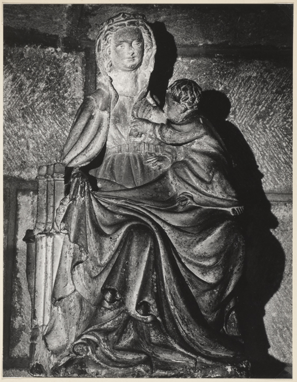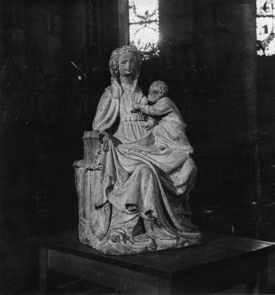 'Assise sur un trône architecturé, Marie allaite un Enfant Jésus dont l'attitude remuante contraste avec sa sérénité. Le geste précieux par lequel la jeune mère étire l'étoffe de son manteau est fréquent dans les effigies mariales du Gothique international, que la Vierge soit debout (Vierge de l'ancienne coll. Dormeuil) ou assise (Vierge de Cleveland).' (B. Chancel-Bardelot)