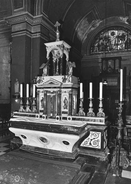 maître-autel, gradin d'autel, tabernacle, dais d'autel, statuettes : quatre Evangélistes (les), saint Pierre, saint Paul
