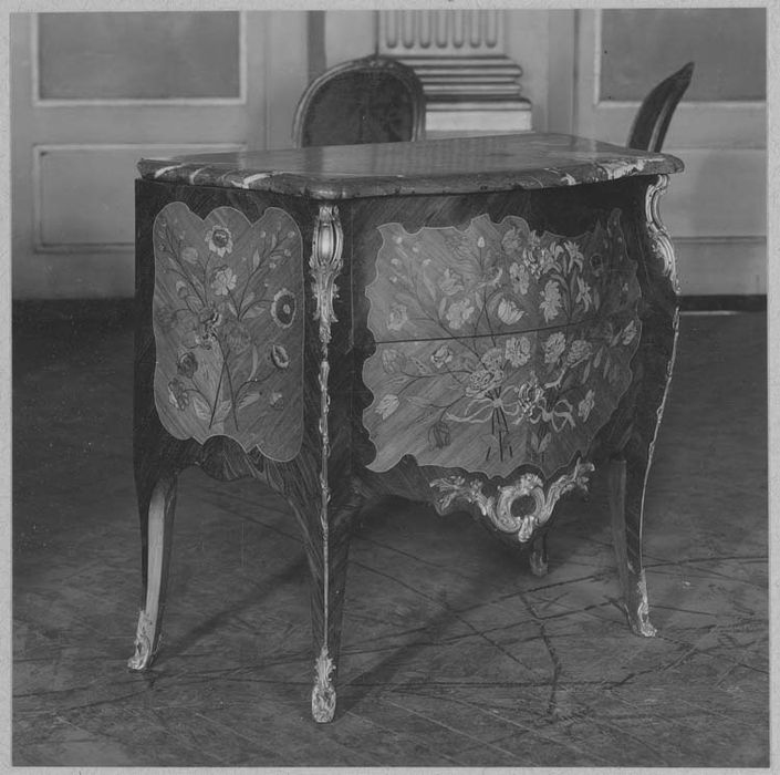 Epoque Louis XV. Cette commode faisait partie du mobilier de l'hôtel de Charles Antoine Claude de Chazerat, dernier intendant d'Auvergne (1775-1789). Cet hôtel fût acheté avec ses meubles par l'Etat en 1844, pour servir de palais épiscopal affectation qu''il a gardé jusqu'en 1905.