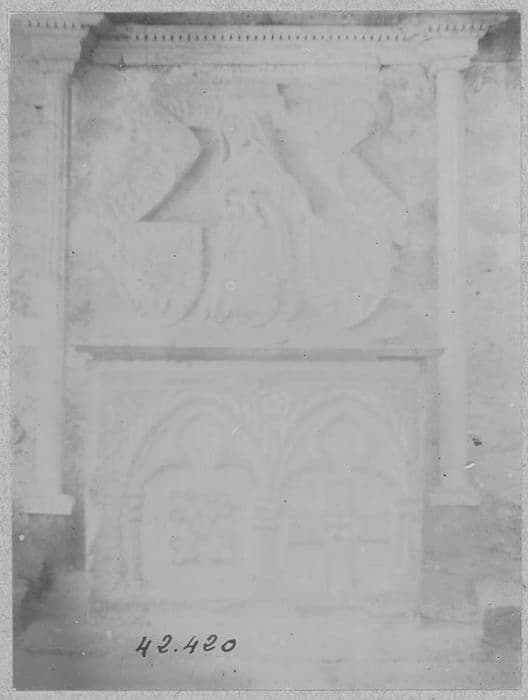 La face principale est formée d'un bas-relief présentant deux arcatures ogivales trilobées contenant l'une à gauche un décor de quatre fleurons, l'autre à droite une croix. Au fronton entre deux arcades une marguerite.