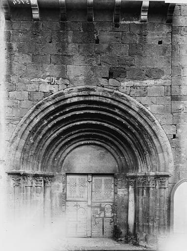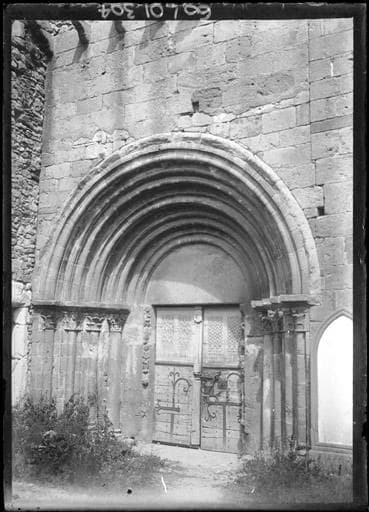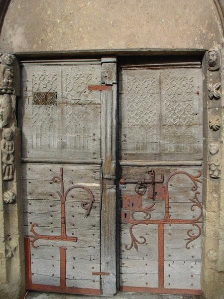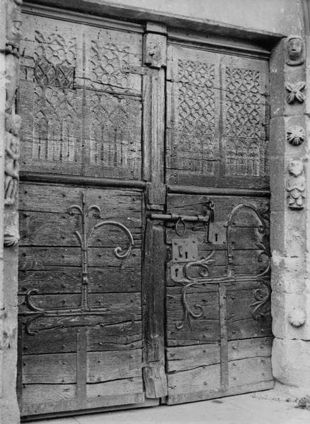Garnis de pentures en fer forgé. La partie supérieure des vantaux est sculptée de petites arcatures et d'un remplage flamboyant.