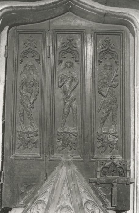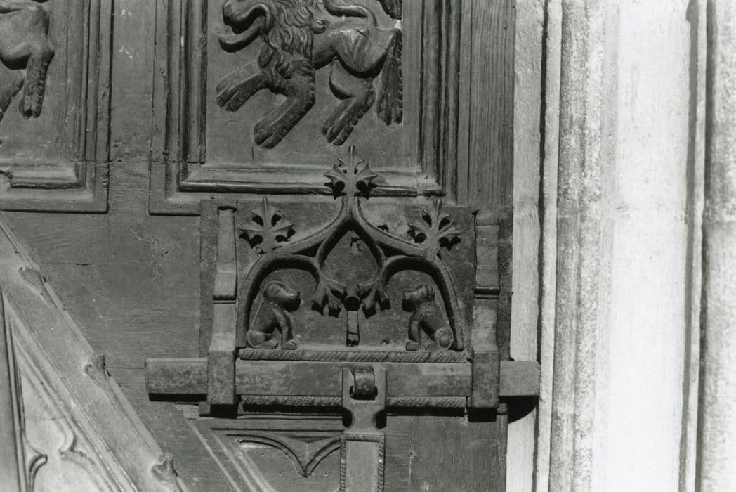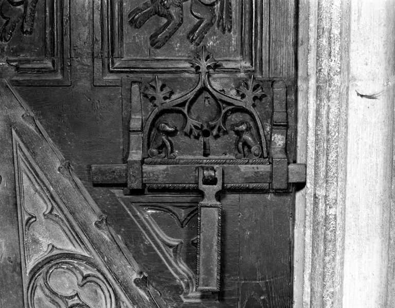 Le vantail est divisée en trois compartiments au centre Eve tenant deux feuilles de vigne, à droite et à gauche Adam recouvert d'une épaisse toison, sous les pieds de chaque personnage un lion. Le verrou est monté sur polatre en forme d'arcade en accolade fleuronnée, à droite et à gauche un chien assis.