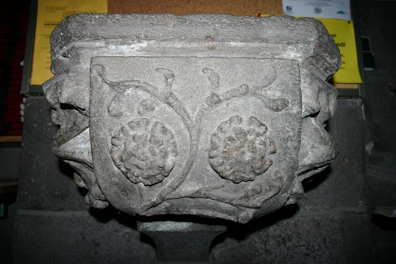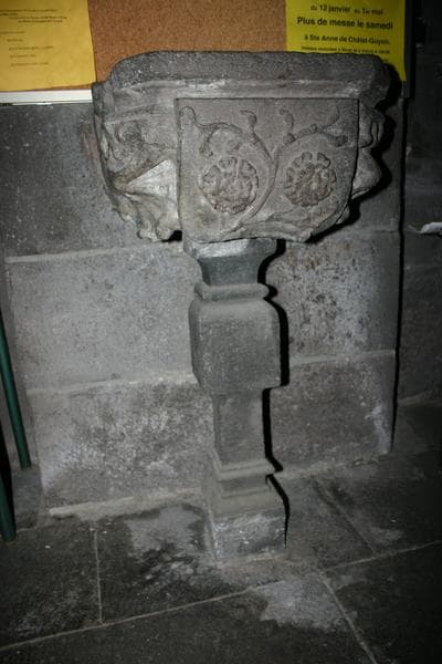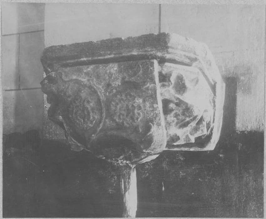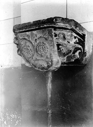 Vasque de petites dimensions scellée dans le mur ornée de feuilles de choux d'un très haut-relief et d'un écusson où l'on distingue trois marguerites.
