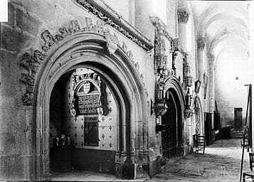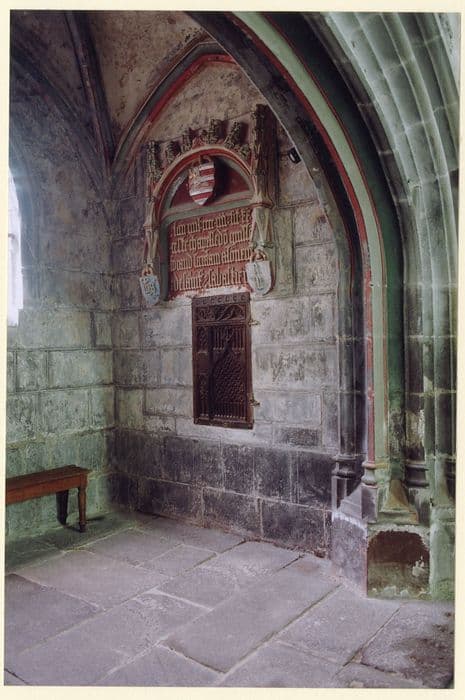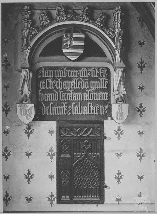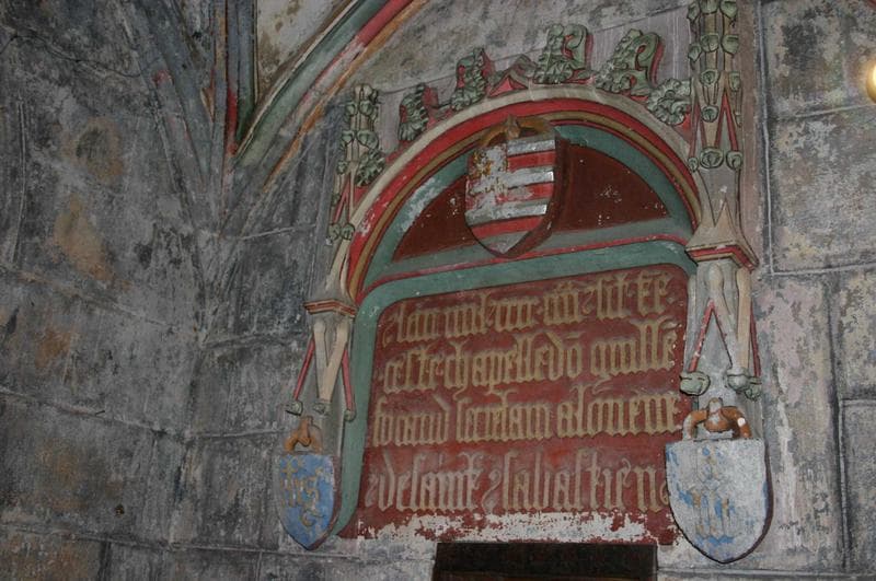 L'inscription est inscrite dans une arcature au cintre surbaisé et décoré de feuilles de choux et de clochetons. Au tympan pend un écusson avec les armoiries du donateur. A droite et à gauche, dans la partie basse, deux autres écussons avec des monogrammes.