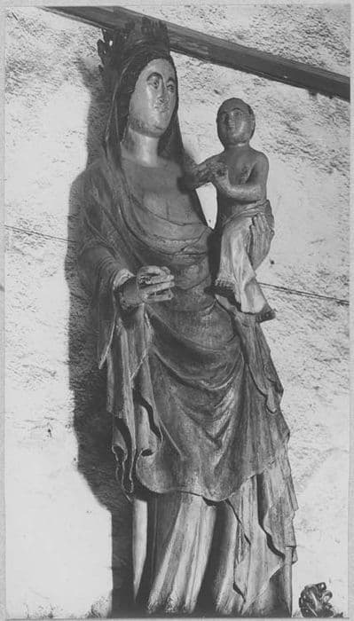 L'enfant tient un oiseau entre ses mains. La Vierge tenait autrefois dans la main droite un objet qui a disparu. La même main a été cassée et maladroitement recolée.