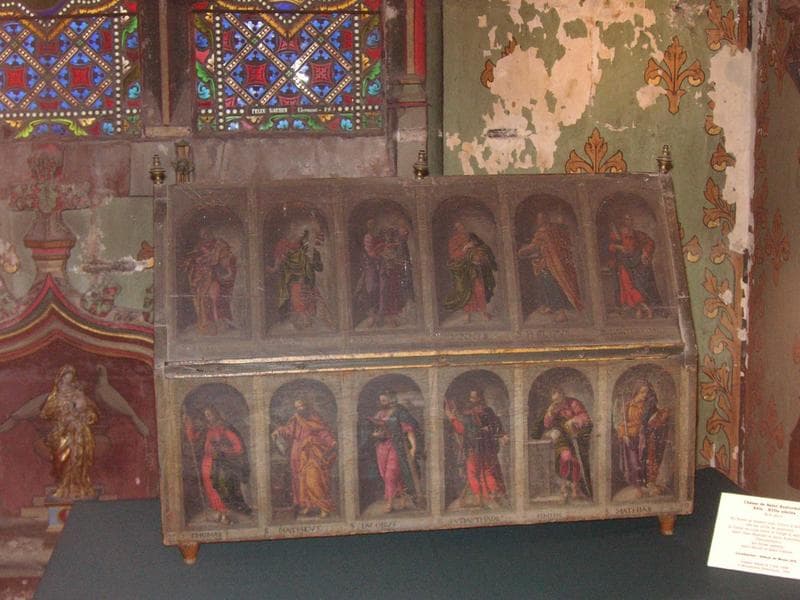 En forme de maison avec toiture à deux eaux elle est ornée de peintures : le Christ en croix entre la Vierge et saint Jean l'Annonciation les douze apôtres saint Jean-Baptiste et saint Austremoine saint Benoît et saint Calmin.