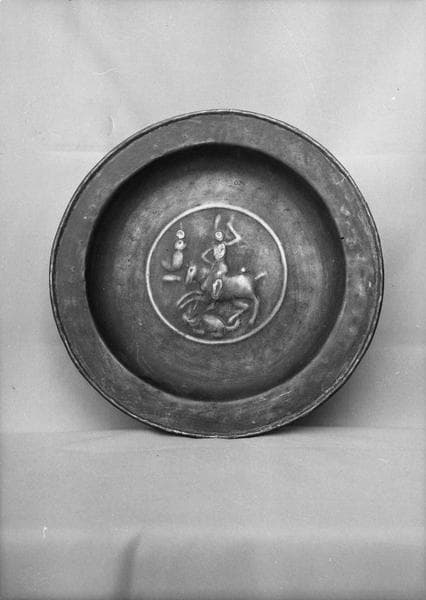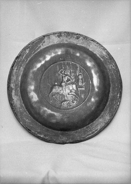 Avec motif central : saint Georges terrassant le dragon. Le travail de décor est exécuté en relief repoussé au marteau.