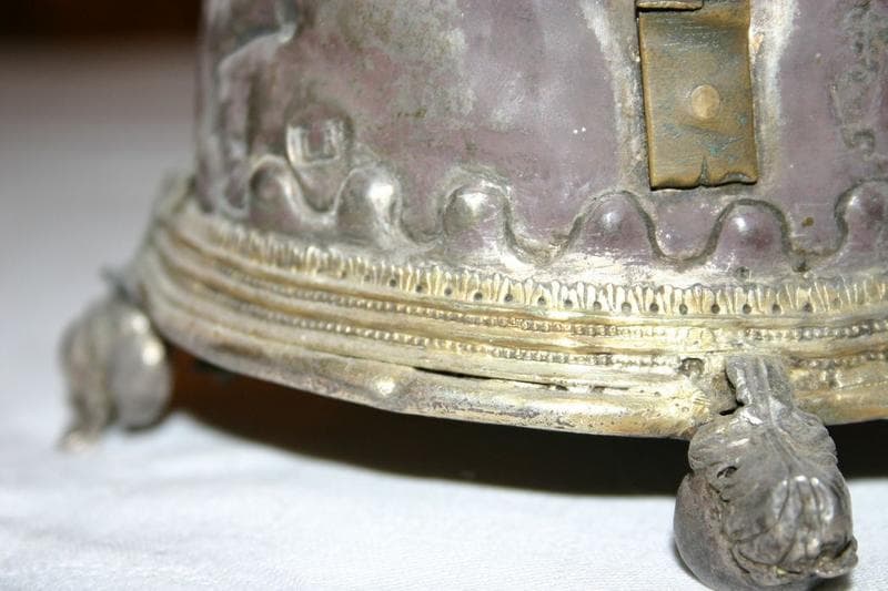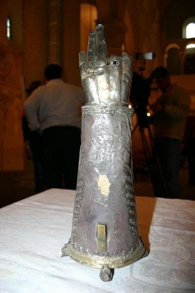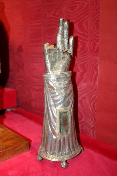 Au milieu de la face antérieure de l'avant-bras est une ouverture rectangulaire fermée par un verre fixe et permettant de voir les reliques à l'intérieur. A sa base l'avant-bras est fermé par une plaque métallique mobile, permettant de sortir et de rentrer les reliques.