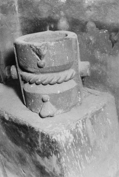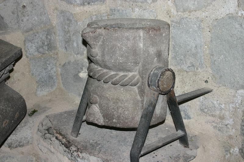 Fut avec mouluration funiforme au milieu, les deux récipients étant creusés aux extrémités. Deux tourillons permettaient de faire pivoter l'étalon et de se servir alternativement des deux récipients pourvus chacun de deux becs déversoirs.