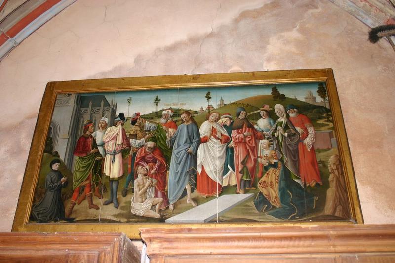"Le Christ, en robe conventionnelle gris-bleutée, entouré de saint Jean et de saint Pierre, ressuscite Lazare devant ses soeurs et neuf spectateurs ; ""Lazare Veni Foras"" est écrit au-dessus de la tête du Christ en lettres d’or dans le ciel. Le Christ, représenté au premier plan au centre du tableau, fait un geste de bénédiction (index et majeur levés) sur Lazare ressuscité, encore enveloppé du linceul d’ensevelissement traditionnel, les yeux fixés sur son divin bienfaiteur.