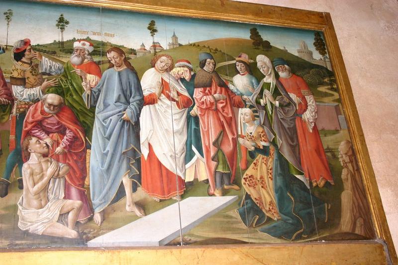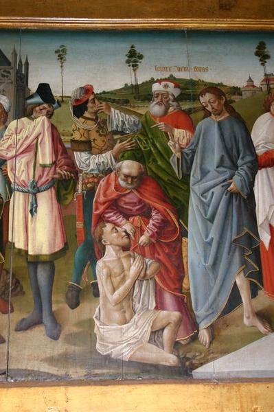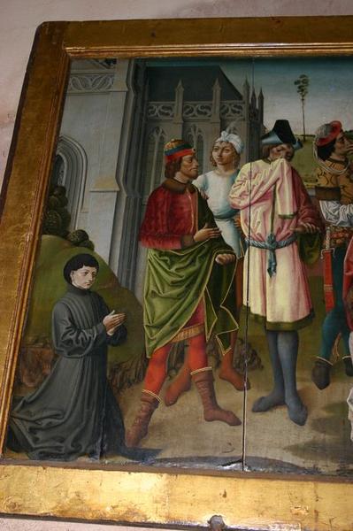 A l’extrême gauche, à côté de ce dernier, un homme en prière, assez jeune, se tient à genoux les mains jointes ; la soutane noire dont il est vêtu et l’intégrité de sa chevelure brune semble montrer en lui un prêtre séculier. On peut supposer qu’il s’agisse du commanditaire du tableau, ceux-ci se faisant souvent représenter, dans cette position agenouillée, sur les oeuvres qu’ils commandaient. Cet élément semble confirmé par la présence du blason peint à gauche de ce personnage, qui a volontairement été gratté afin de faire disparaître les armes qui y figuraient.