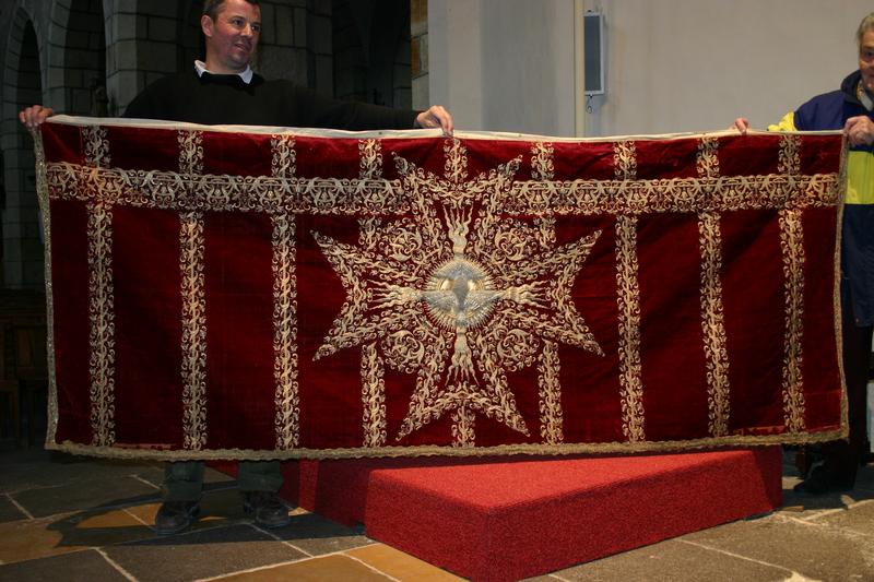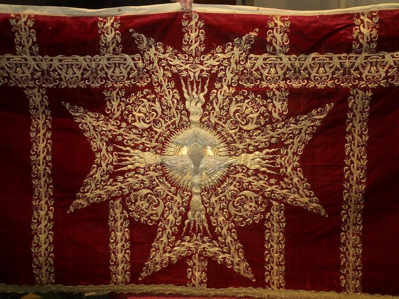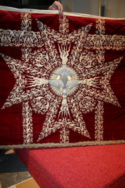 Une bande horizontale et neuf verticales divisent cette tenture en compartiments réguliers. Ces bandes sont décorées de rinceaux faits de spirales et de petites fleurs disposées symétriquement ça et là de petites paillettes rondes. Au milieu une croix de Malte faite des mêmes éléments, encadrant un Saint Esprit planant dans un soleil. De la tête, des ailes et de la queue partent des flammes et des rayons disposés en quatre faisceaux. Travail de broderie remarquable.