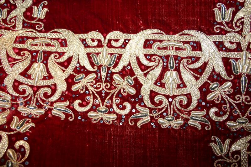 Velours cramoisi avec ornements brodés d'or et d'argent.