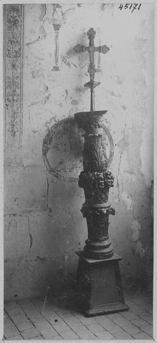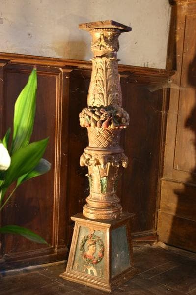 D'un socle carré, uni et pyramidal part une colonne à plusieurs renflements, chargée de fleurs et de fruits sculptés en demi-relief.