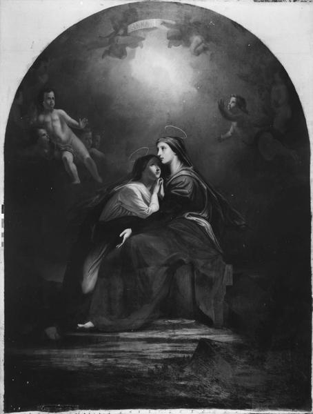Toile signée et datée en bas à gauche : A. Michel-Villeblanche 1858. Inscription, en haut sur la banderole : AVE ANNA ET MARIA.
