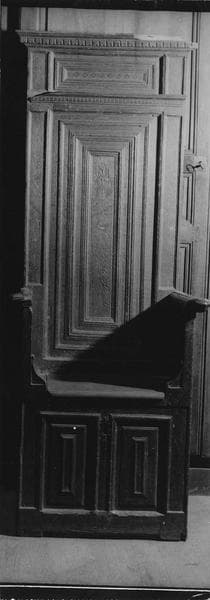 Au centre du panneau formant dossier, une sculpture en très faible relief : tête de satyre, de la bouche duquel pendent des feuillages.