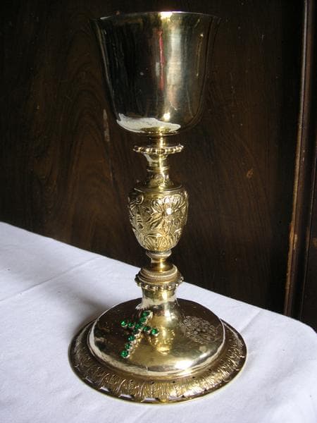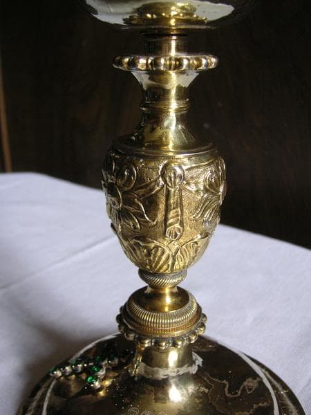 Coupe simple tulipe ; deux collerettes perlées, noeud en balustre : décor floral, fleurs, fruits et draperies ; pied profil en talon, bord frise de feuilles d'acantes repercée et ajourée, croix gravée et croix rapportée fixée or et émeraudes.
