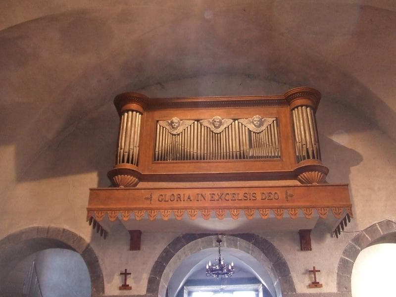 Orgue de type armoire et ses 10 rouleaux d'origine dans leur boîte. Il est installé sur une tribune en développant une façade de 200 tuyaux derrière laquelle se trouve le mécanisme.