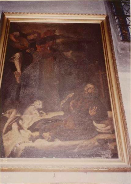 tableau, cadre : saint François-d'Assise sur son lit écoutant la musique d'un violoniste