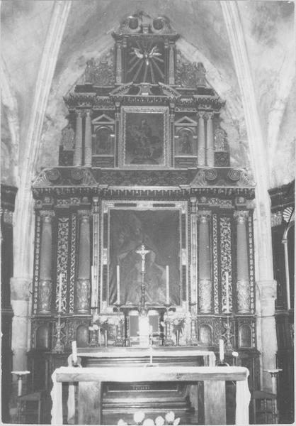 autel, tabernacle, croix et 6 chandeliers d'autel, retable, tableau d'autel : saint Ambroise évêque, et 3 tableaux : la Vierge de l'Apocalypse, saint Laurent et sainte Catherine d'Alexandrie (maître-autel)