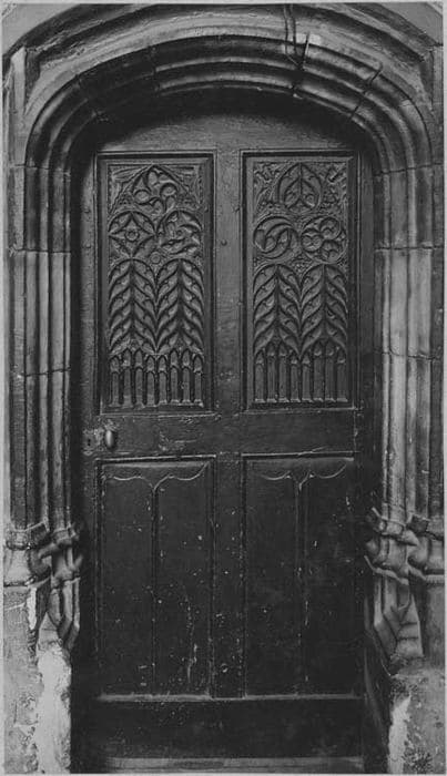 Vantail divisé en quatre panneaux rectangulaires. Il garnit encore l'élégante porte en anse de panier pour laquelle il a été fait.