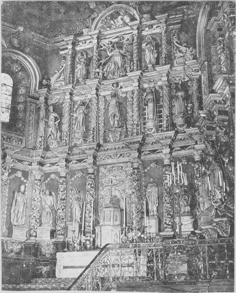 Retable de style espagnol occupant tout le fond du choeur. Tous les parements du retable ainsi que les éléments suclptés sont en noyer de bonne qualité.