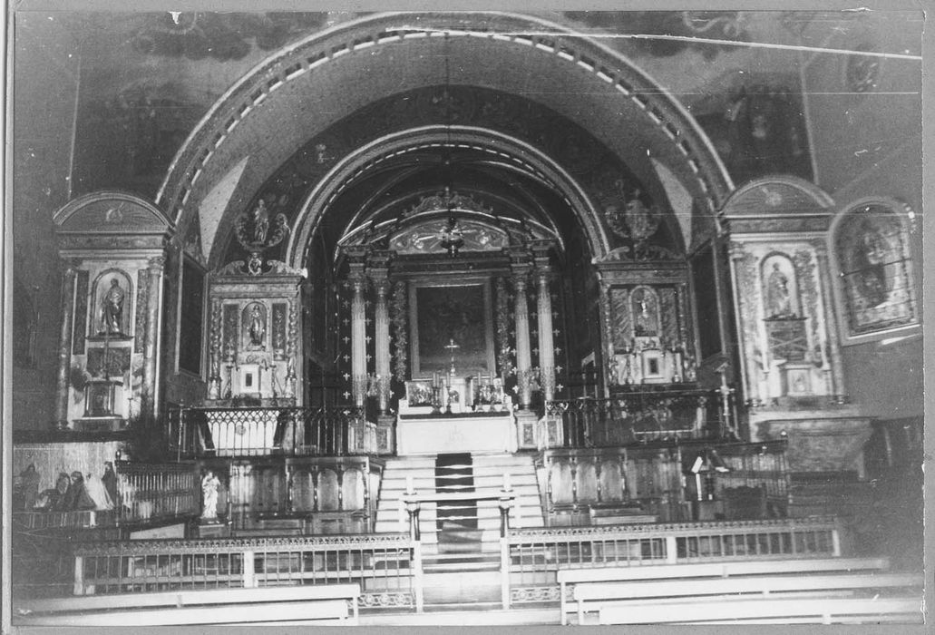 Ensemble du décor du choeur comprenant le maître-autel 4 autels latéraux et leurs retables grilles du choeur en fer forgé lambris escalier toiles et statues.