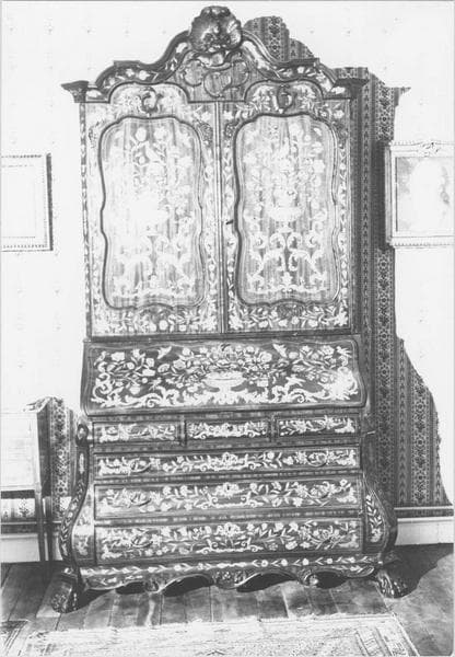 N° 9. grand meuble scriban en marqueterie à décor de vases de fleurs et d'oiseaux, la partie supérieure à deux vantaux surmontés d'un fronton curviligne, la partie inférieure à un abattant et six tiroirs galbés, pieds griffés.
