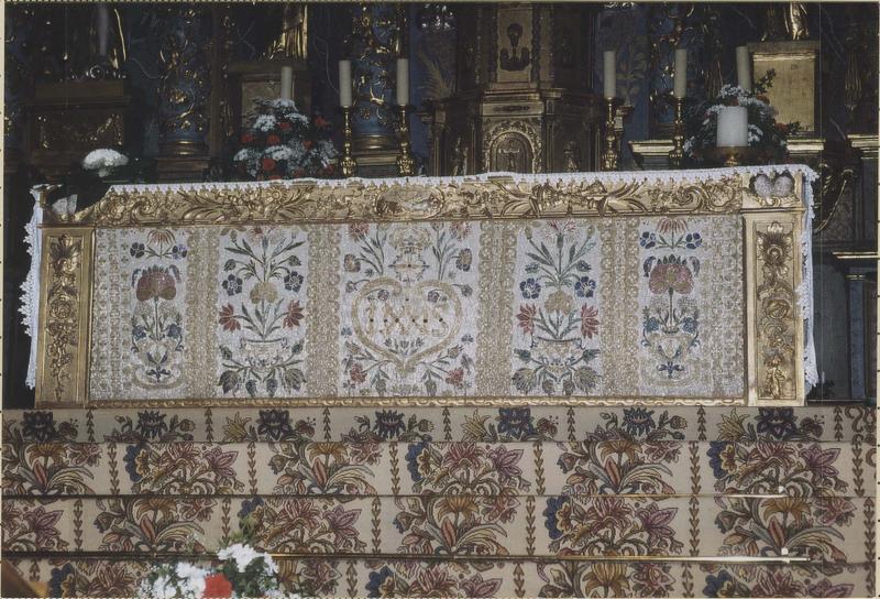 Parement d'autel en broderie de fils de soie et de perles de verres coloré.