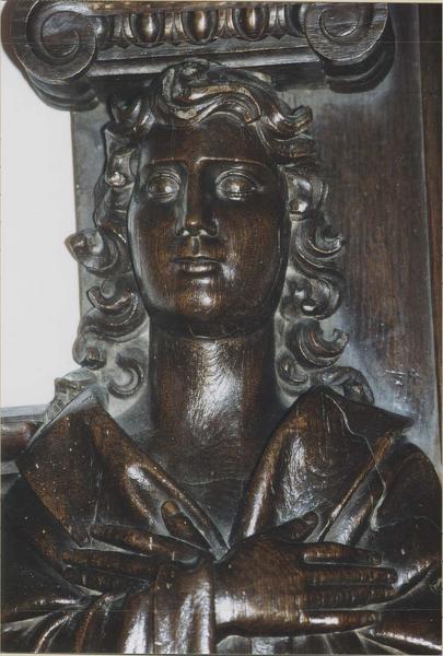 Cuve en pierre. Socle, couvercle-armoire et boiseries en chêne sculpté. La boiserie qui encadre la niche comporte de part et d'autre un terme, avec un sommet orné d'une scène en demi-relief. La cuve baptismale est surmontée d'un couvercle-armoire.