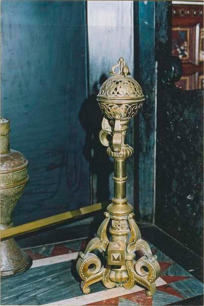 Paire de chenets et leur barre transversale de section carrée. Sur le principe des landiers, chaque chenet porte à son sommet une coupelle brûle-parfums.