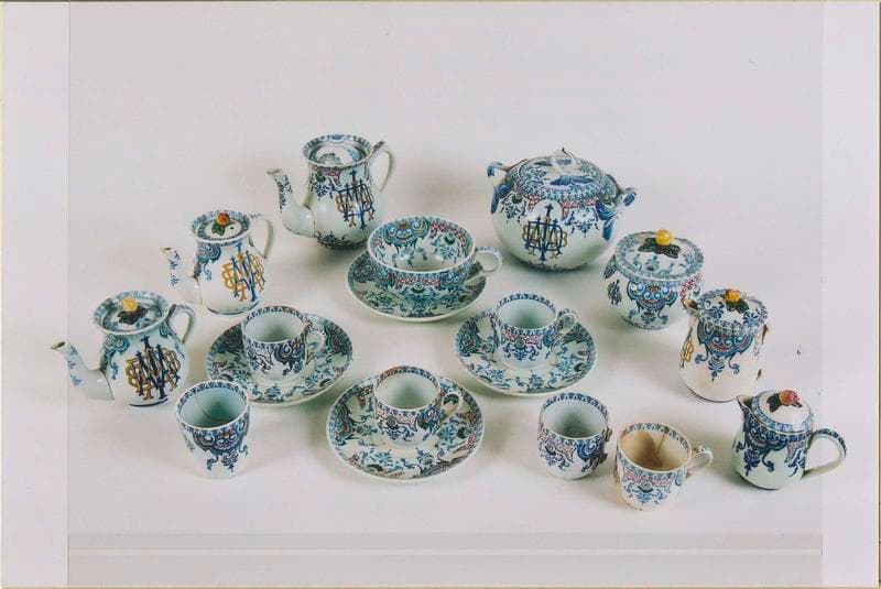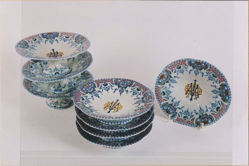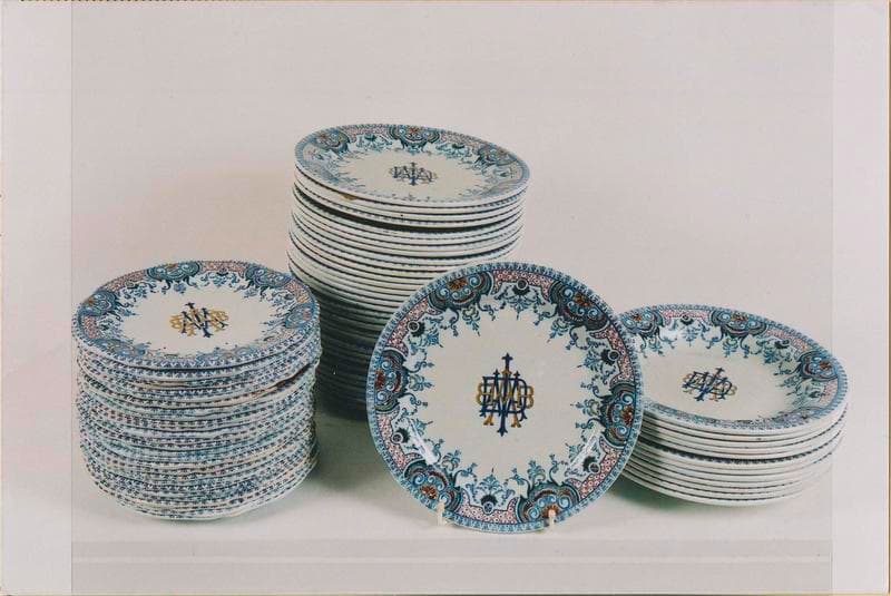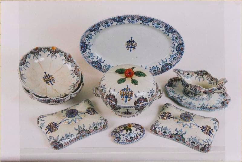 assiette (81) ; soupière ; plat (3) ; saladier ; saucière ; couvre-plat (8) ; jatte (7) ; coquetier (7) ; ravier (2) ; porte-couteau (15) ; sucrier (2) ; pichet (3) ; pot à lait de déjeuner (2) ; bol à thé ; soucoupe (4) ; tasse (5) ; gobelet