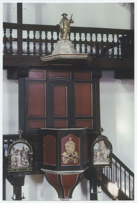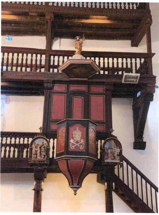 Chaire à prêcher en bois sculpté, peint et doré, avec cuve polygonale sur culot.