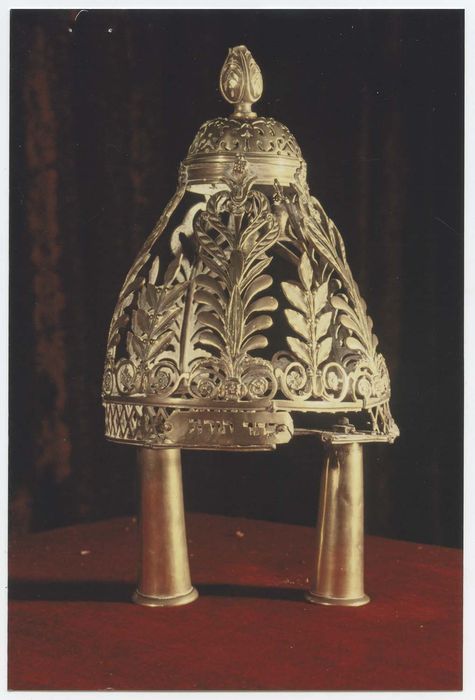 Deux couronnes de Torah (dites Keter Torah et au pluriel : Ketarim) : l'une en cuivre (en réserve) et l'autre en argent repoussé (sur la table de lecture).