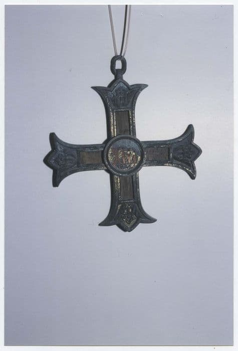 Chemin de croix en bronze et faux émail, à l'exception des stations II; VII et VIII (disparues), aujourd'hui en résine de composition, à base de poudre d'aluminium. Les quatre branches des croix sont d'égale longueur et s'inscrivent dans un carré de 15 centimètres de côté.