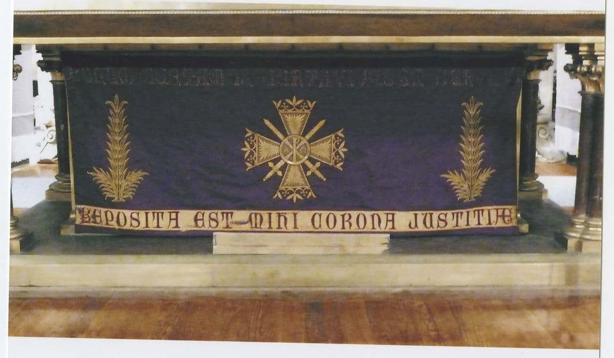 Premier antependium : pékin de soie rosé semé de fleurs de lys brodées - au centre, l'agneau dans une mandorle fleurdelisée - au bas, frise de colombes sur fond de satin de soie ciel. Broderie au fil de soie, cabochons métalliques. Deuxième antependium : satin de soie rouge semé de fleurs de lys brodées au fil d'or - au centre, SE et l'étoile des armes de l'église Sainte-Eugénie. Broderies de fils de soie et fils d'or. Troisième antependium : soie rouge semée de fleurs de lys - au centre, au cœur d'une croix de velours rouge appliquée, doublement fleurdelisée, l'alpha et l'oméga. Broderie appliquée, fil de soie, cabochons métalliques. Quatrième antependium : soie violette, croix de Malte fleurdelisée, épées entrecroisées, alpha et oméga ; à la frise inférieure inscription. Broderie appliquée.