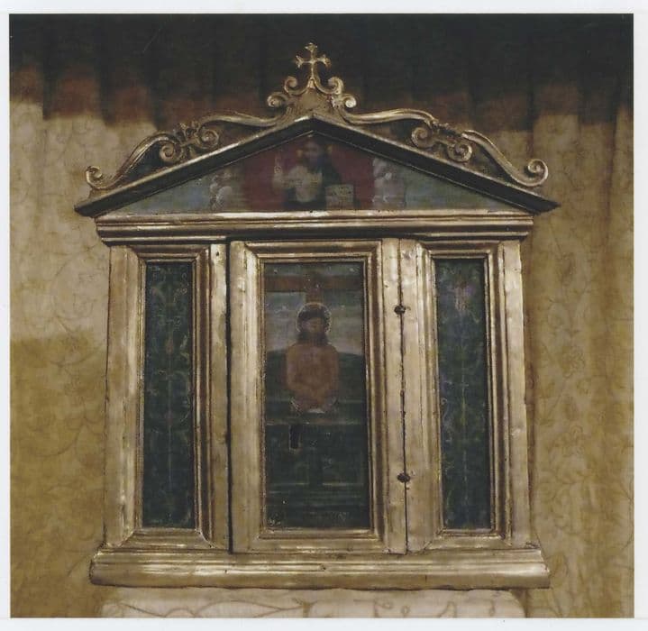 Au fronton, deux ailerons à volutes rentrantes encadrent une croix. A la porte, Christ aux liens adossé à la Croix.