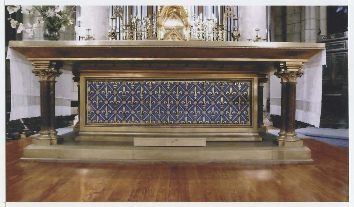 Table d'autel en marbre blanc sur quatre double colonnes de marbre foncé posées sur un bloc de maçonnerie. Les quatre faces revêtues de mosaïques sont cernées de laiton.
