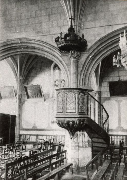 Chaire à prêcher suspendue, adossée à un pilier avec cuve sur culot et abat voix, en bois sculpté, doré et peint.